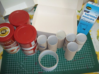 Beim Basteln hab ich mir dann überlegt, dass der Stifthalter nur für die Filzstifte wird. Sonst wird das ganze Ding wieder so schwer. Die Rollen hab ich dann mit verschieden Papieren beklebt und ein Kistchen zurecht geschnitten und ebenfalls beklebt.Fixiert hab ich die Rollen dann mit Holzleim.